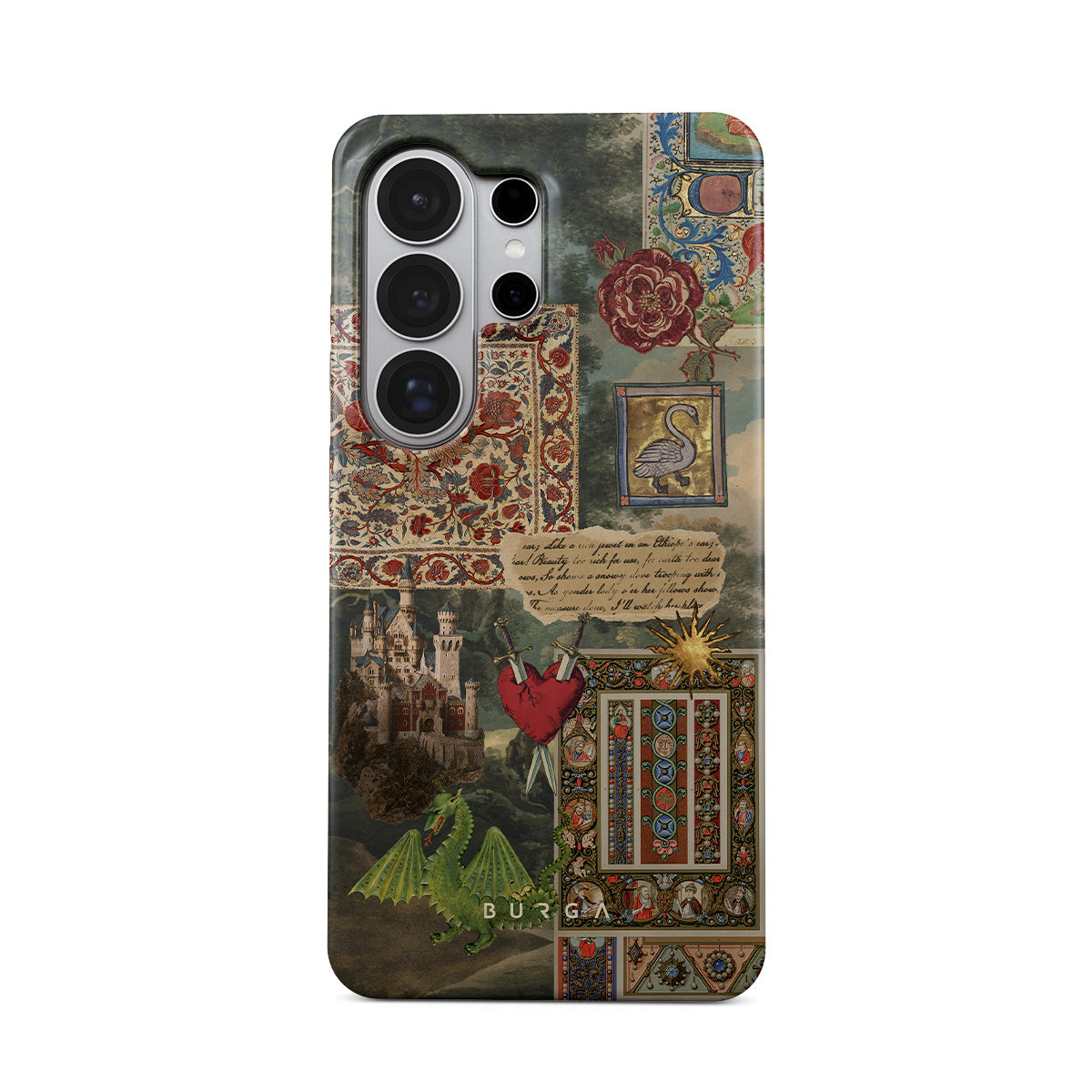 This design features: handwritten calligraphy font, vintage print, medieval design, floral pattern, old book illustrations, heart, dragon, castle