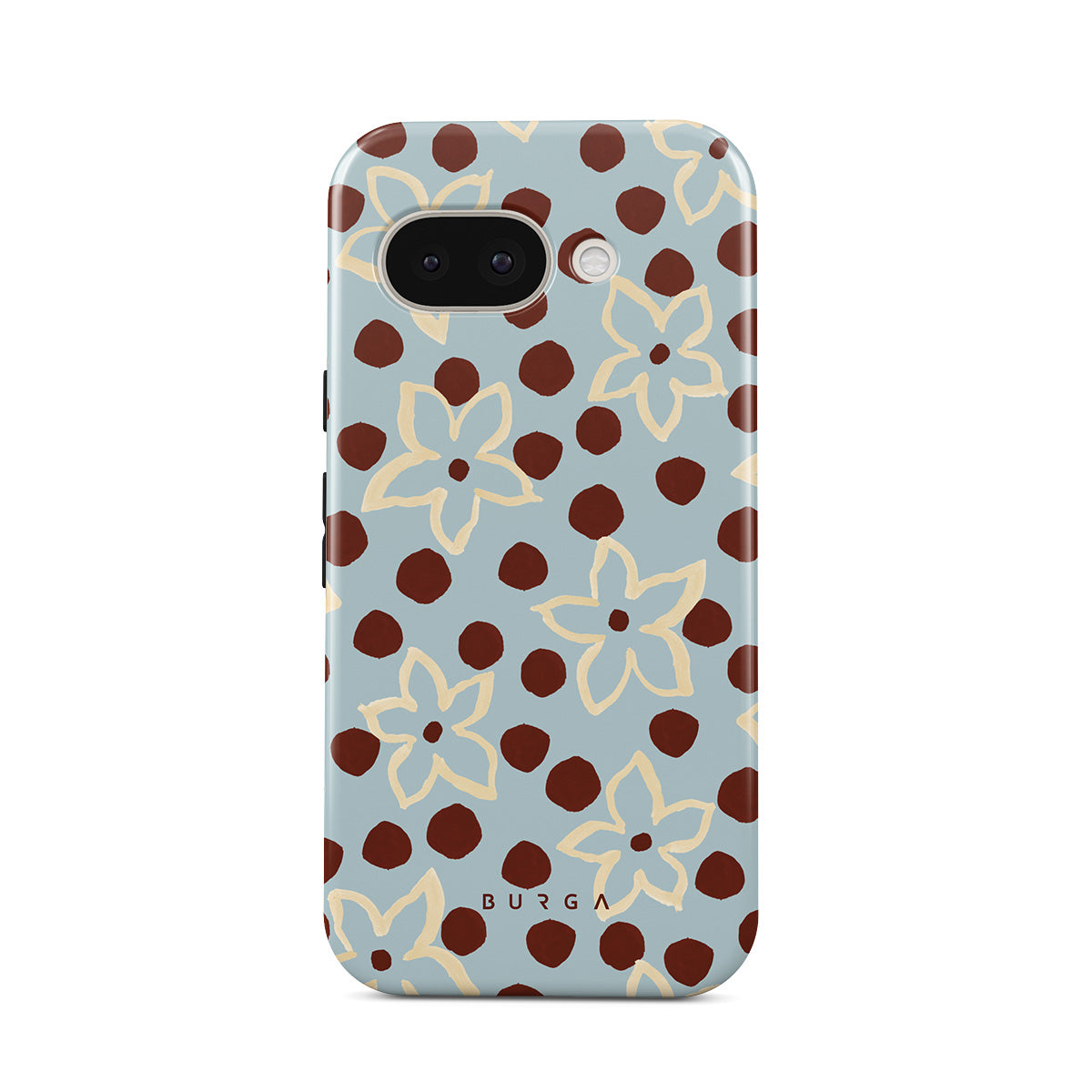 The Frutaria Google Pixel 9a phone case design design: retro surf motel wallpaper meets vintage ceramics. The soft florals, earthy dots, and cool-toned palette give major “forgotten seaside town in the ‘70s” energy.