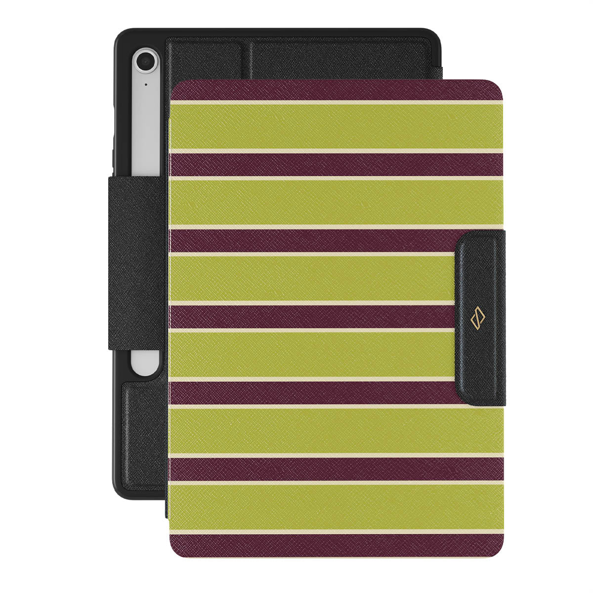 This design features: thick horizontal stripes in lime green and burgundy .