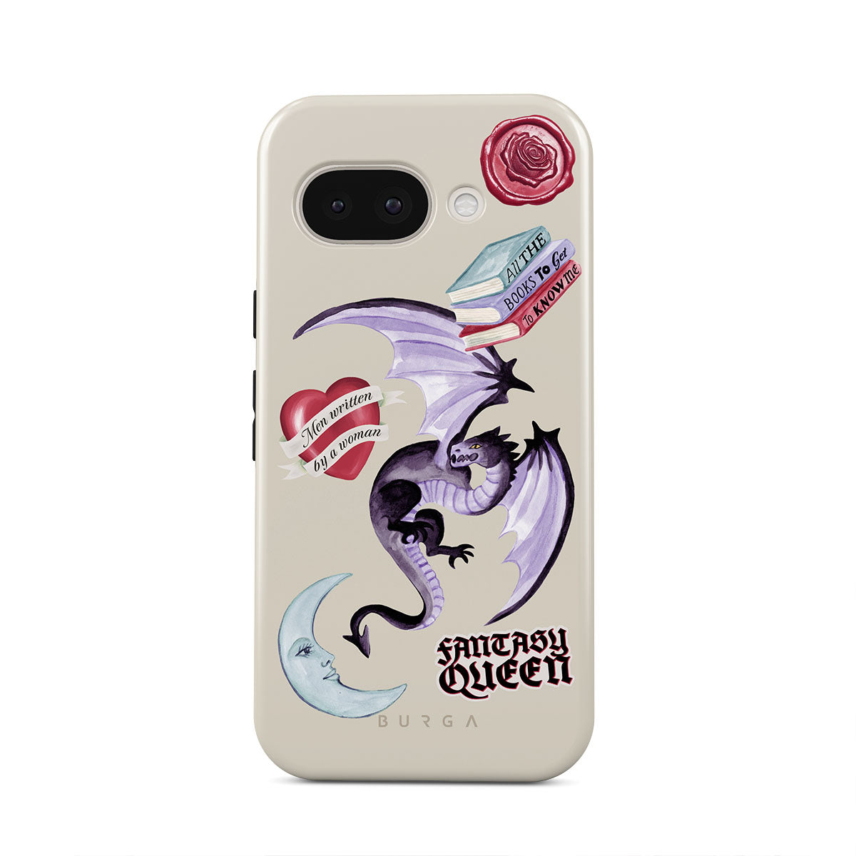 This design features: purple dragon, "Fantasy Queen" sticker, crescent moon, purple wax seal, heart with message, books