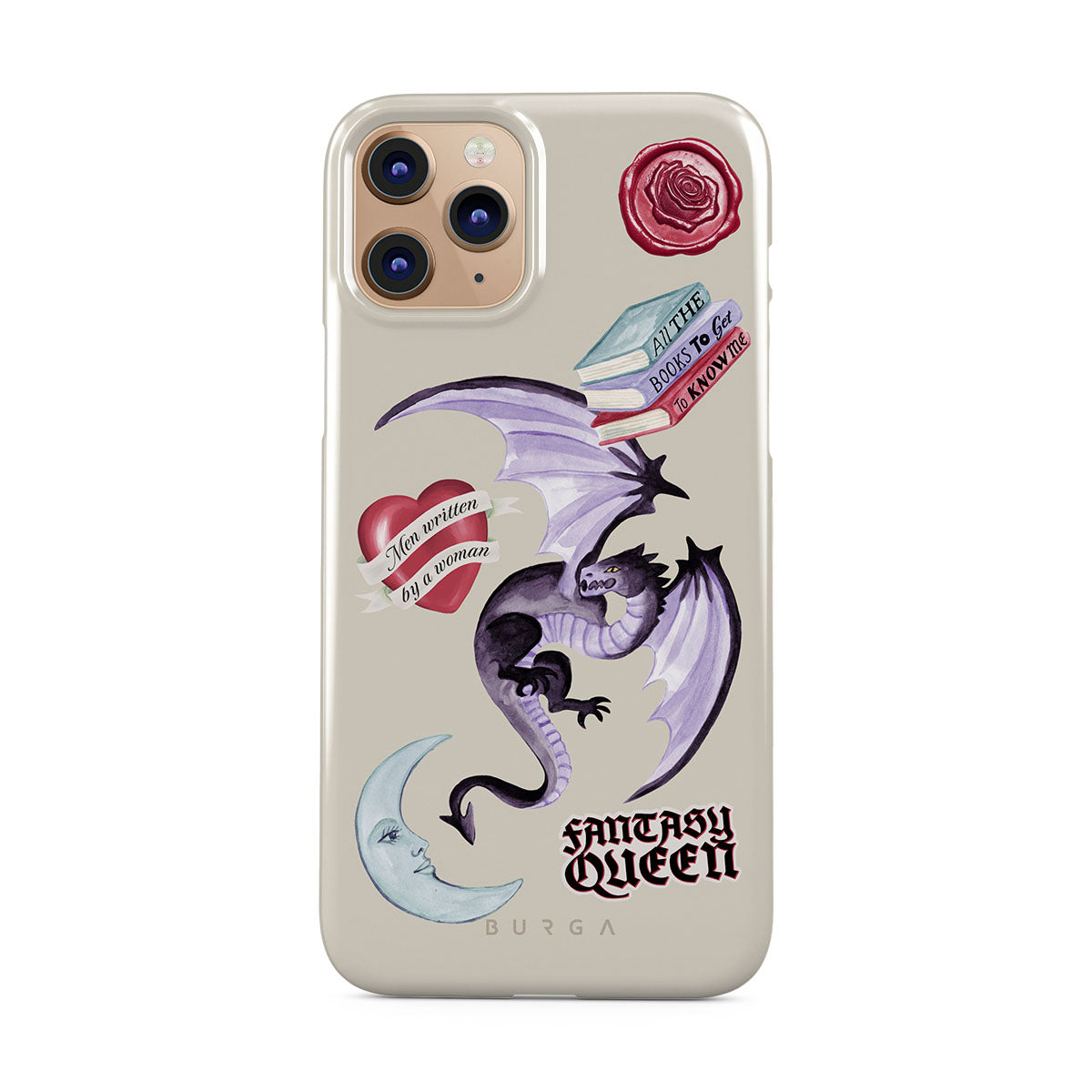 This design features: purple dragon, "Fantasy Queen" sticker, crescent moon, purple wax seal, heart with message, books