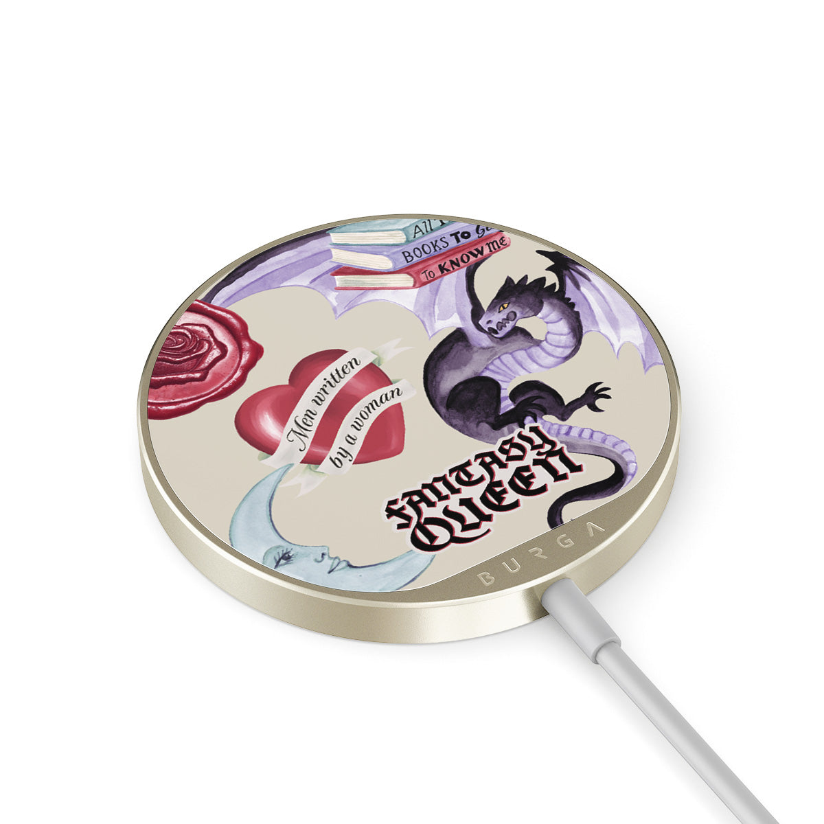 This design features: purple dragon, "Fantasy Queen" sticker, crescent moon, purple wax seal, heart with message, books