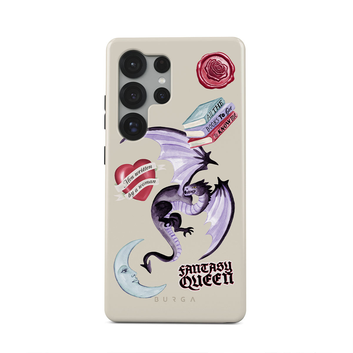 This design features: purple dragon, "Fantasy Queen" sticker, crescent moon, purple wax seal, heart with message, books
