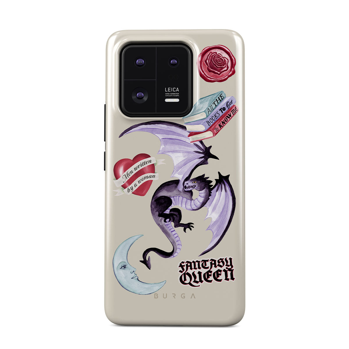 This design features: purple dragon, "Fantasy Queen" sticker, crescent moon, purple wax seal, heart with message, books