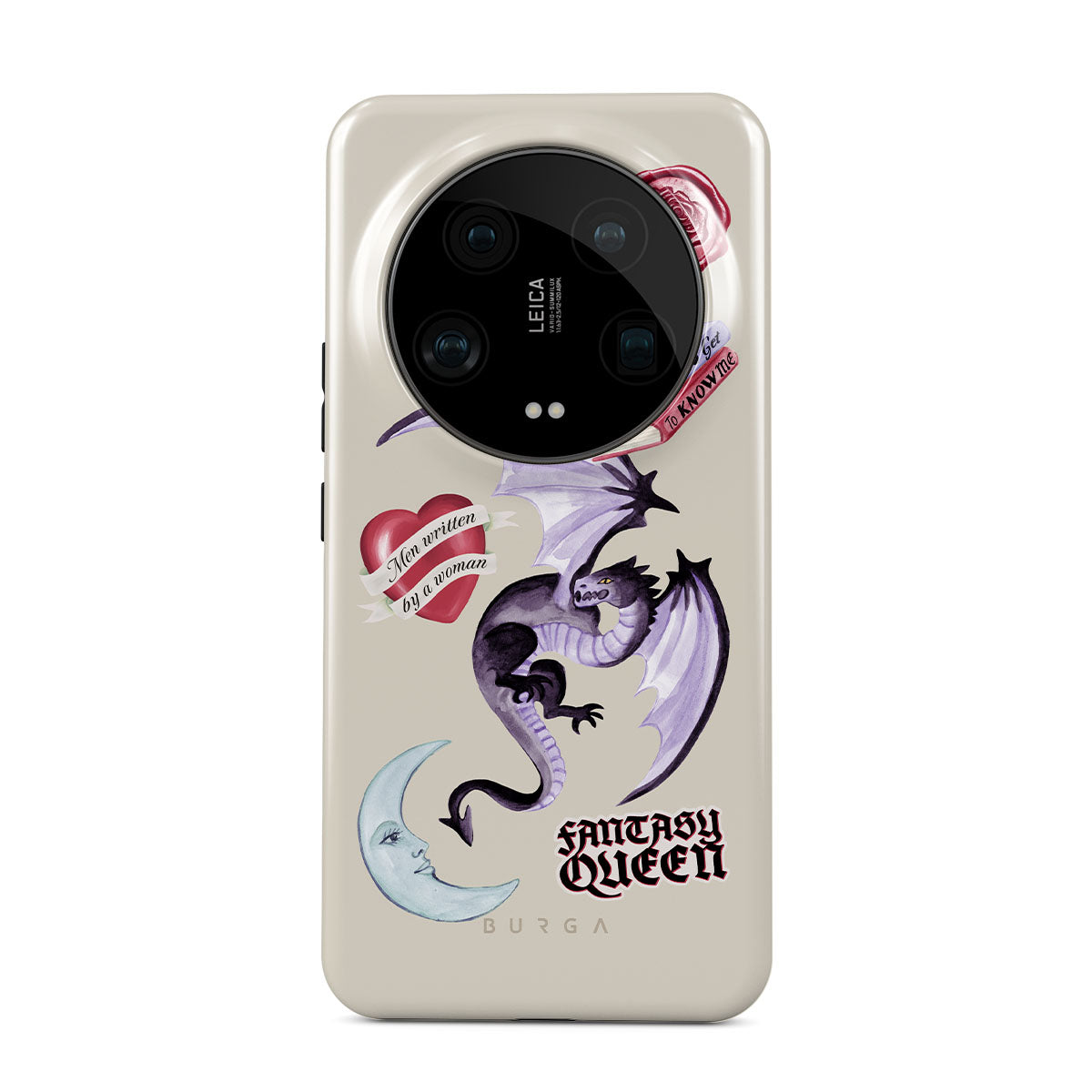 This design features: purple dragon, "Fantasy Queen" sticker, crescent moon, purple wax seal, heart with message, books
