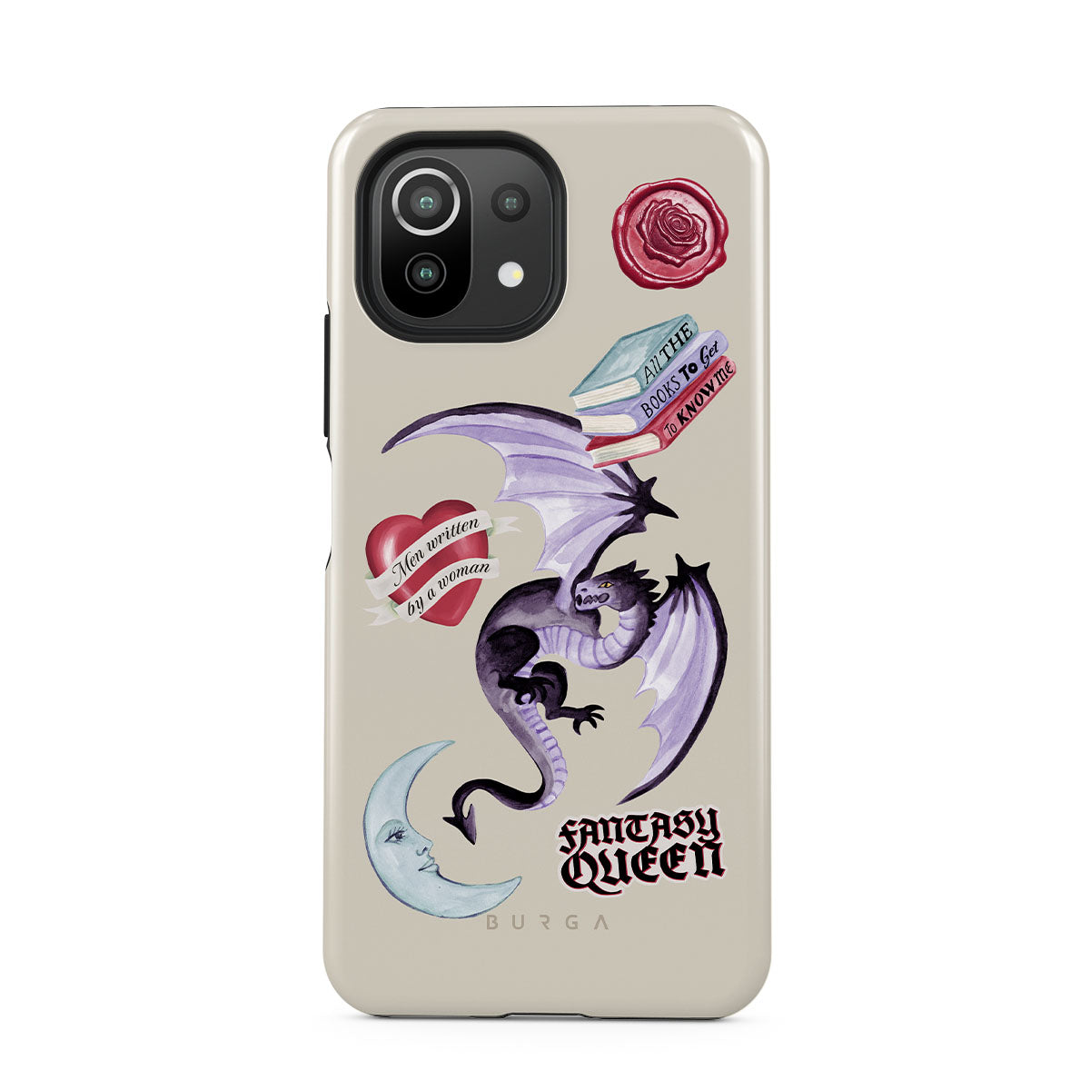 This design features: purple dragon, "Fantasy Queen" sticker, crescent moon, purple wax seal, heart with message, books
