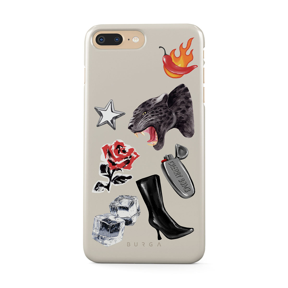 This design features: black panther, red rose, burning bell pepper, silver lighter, black knee-high boots, ice cubes, silver star
