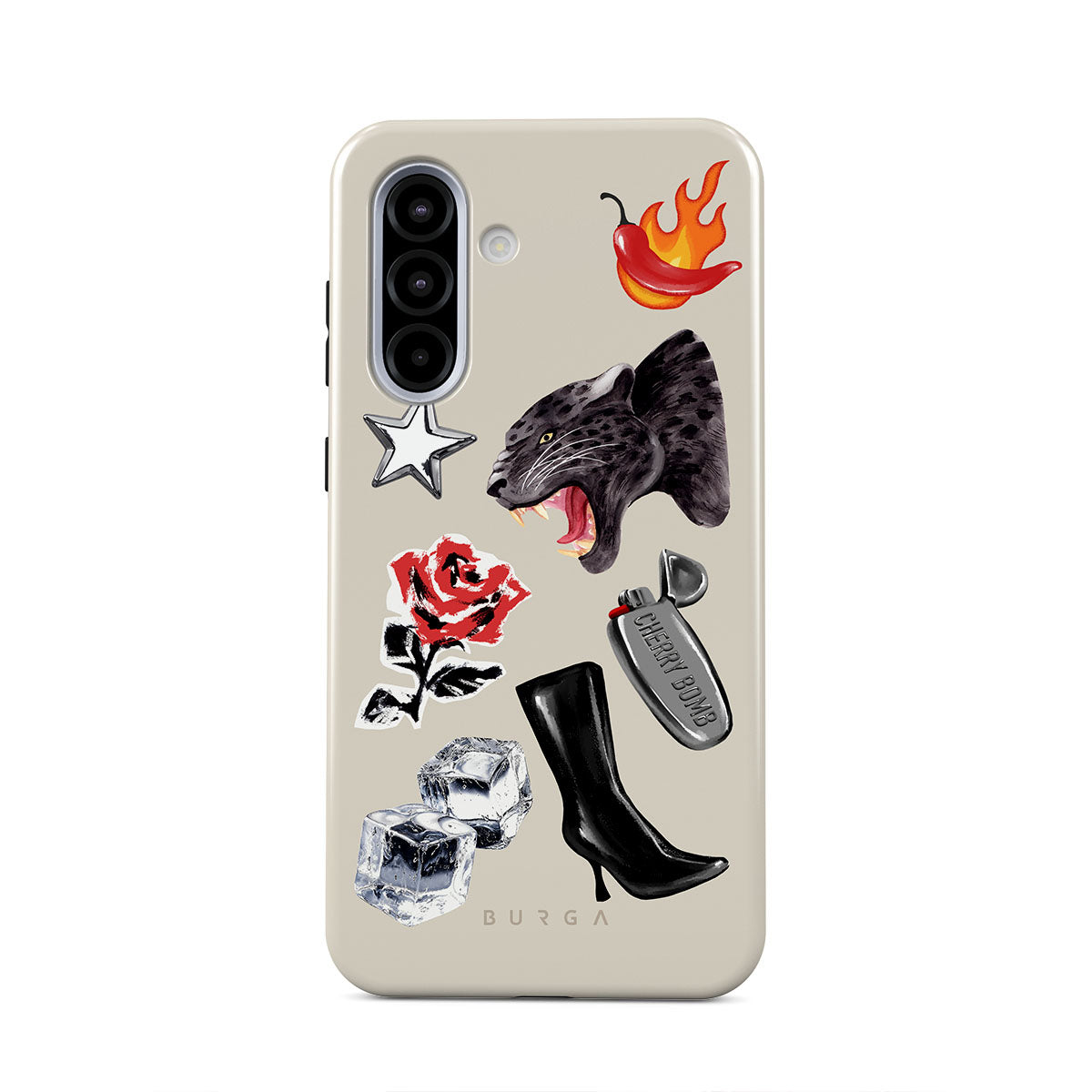 This design features: black panther, red rose, burning bell pepper, silver lighter, black knee-high boots, ice cubes, silver star