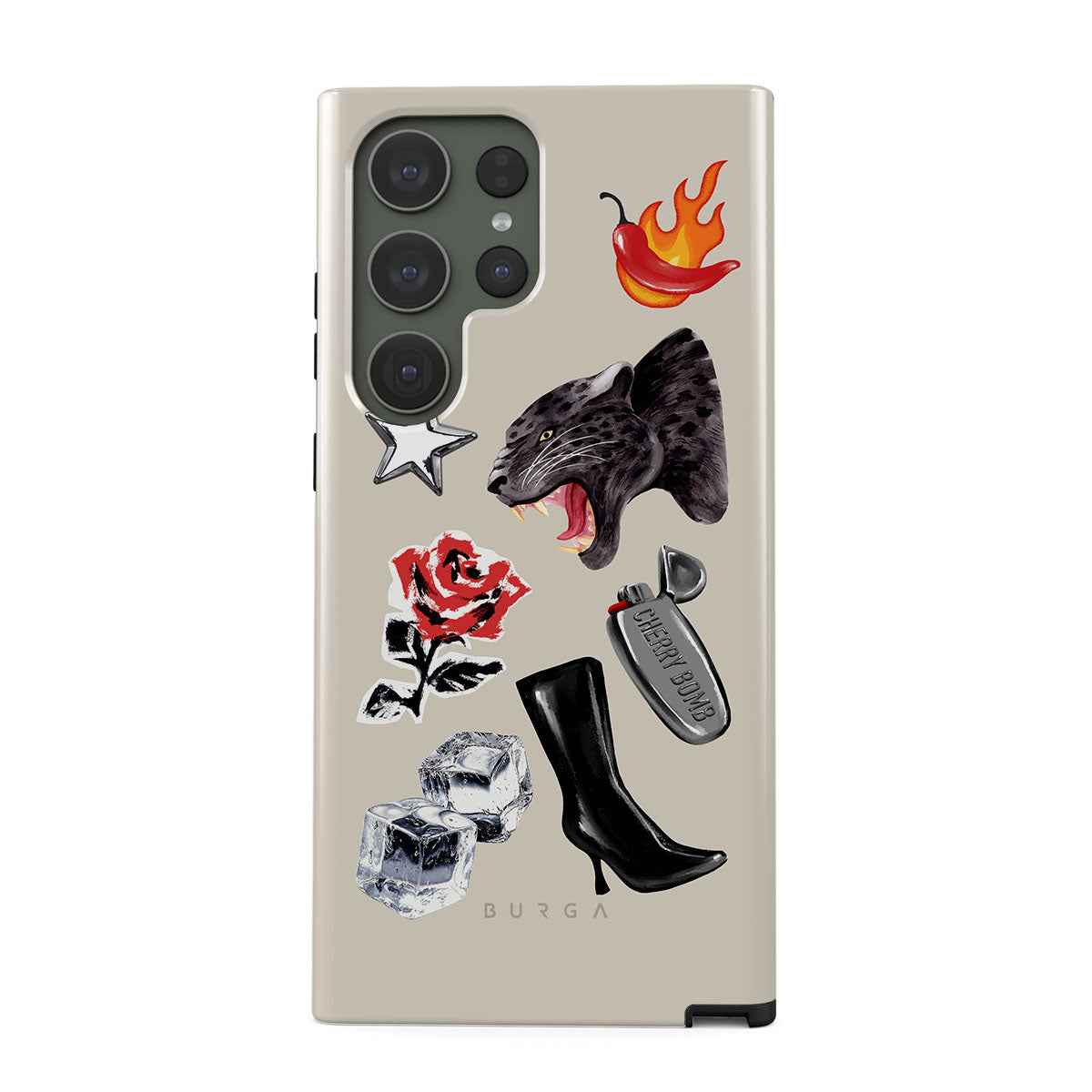 This design features: black panther, red rose, burning bell pepper, silver lighter, black knee-high boots, ice cubes, silver star
