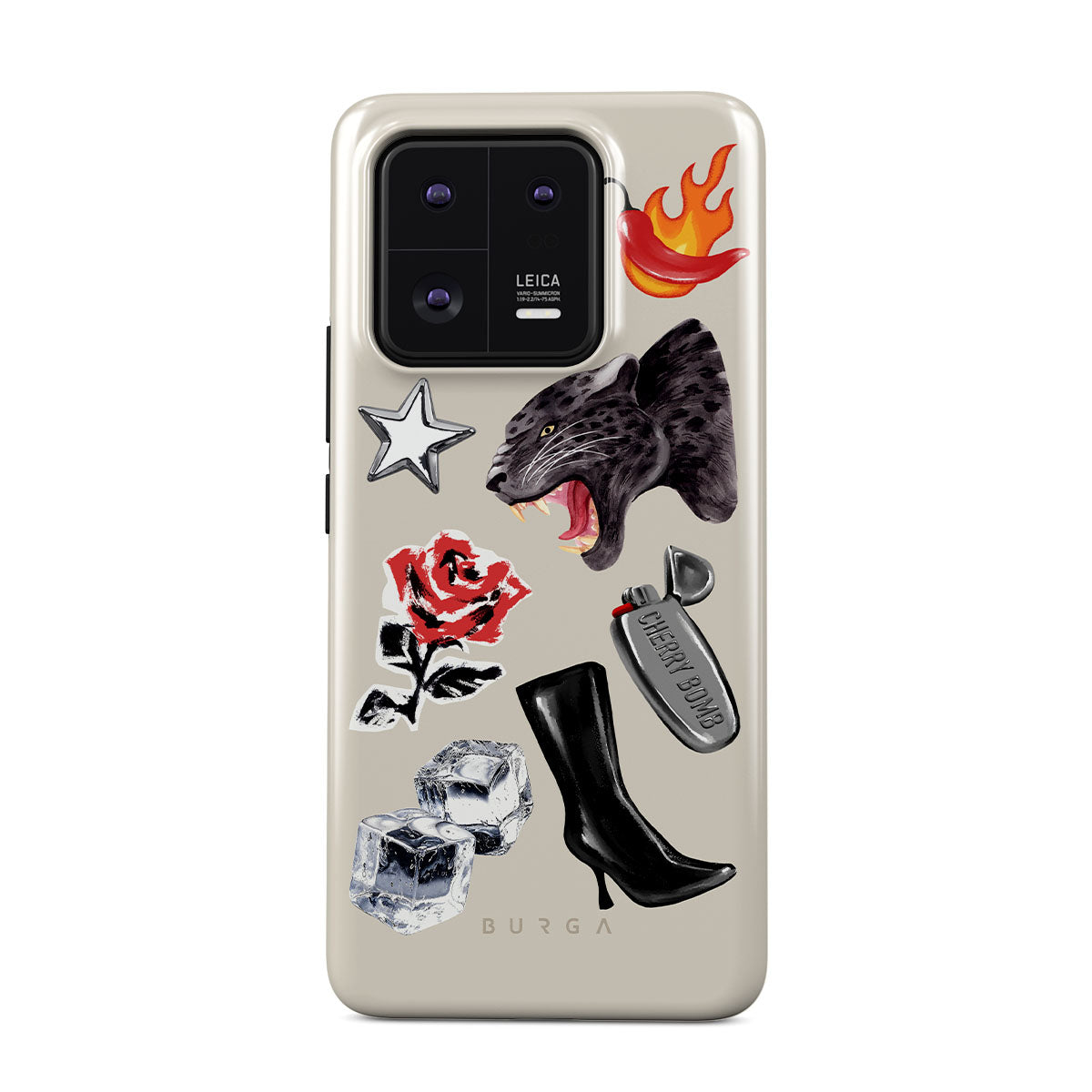 This design features: black panther, red rose, burning bell pepper, silver lighter, black knee-high boots, ice cubes, silver star