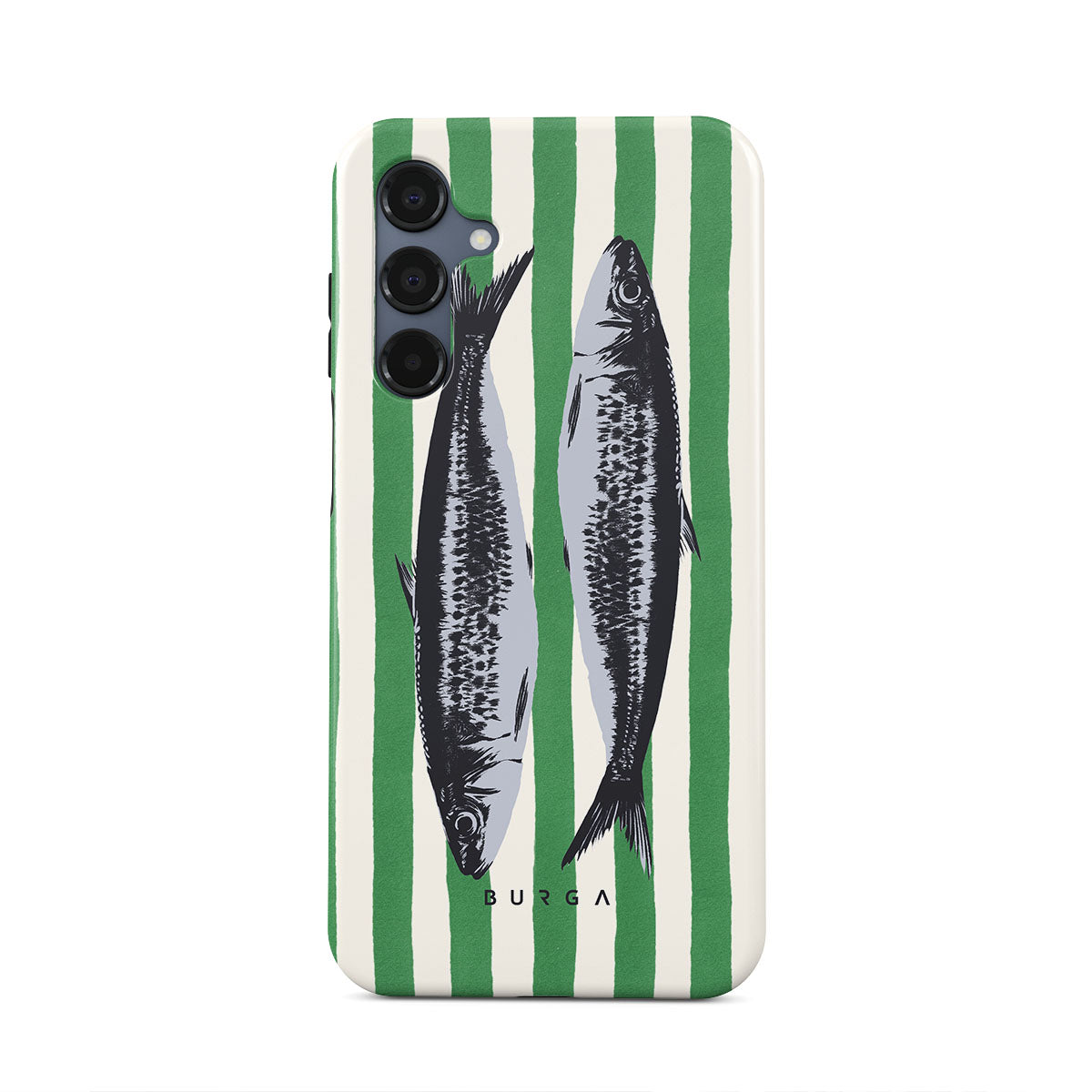 This design features: Sardines, green stripes, ocean motifs