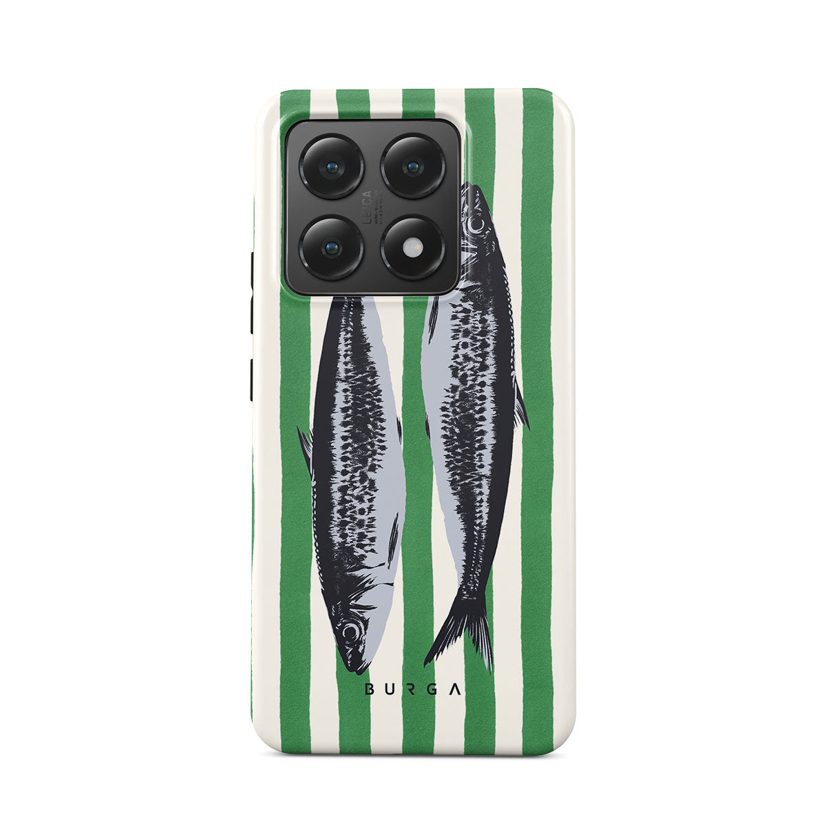 This design features: Sardines, green stripes, ocean motifs