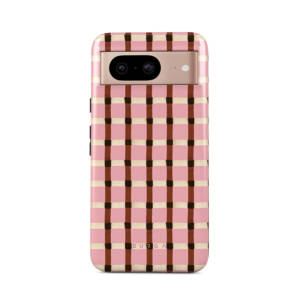 This design features: pink and brown checkered pattern, gingham pattern