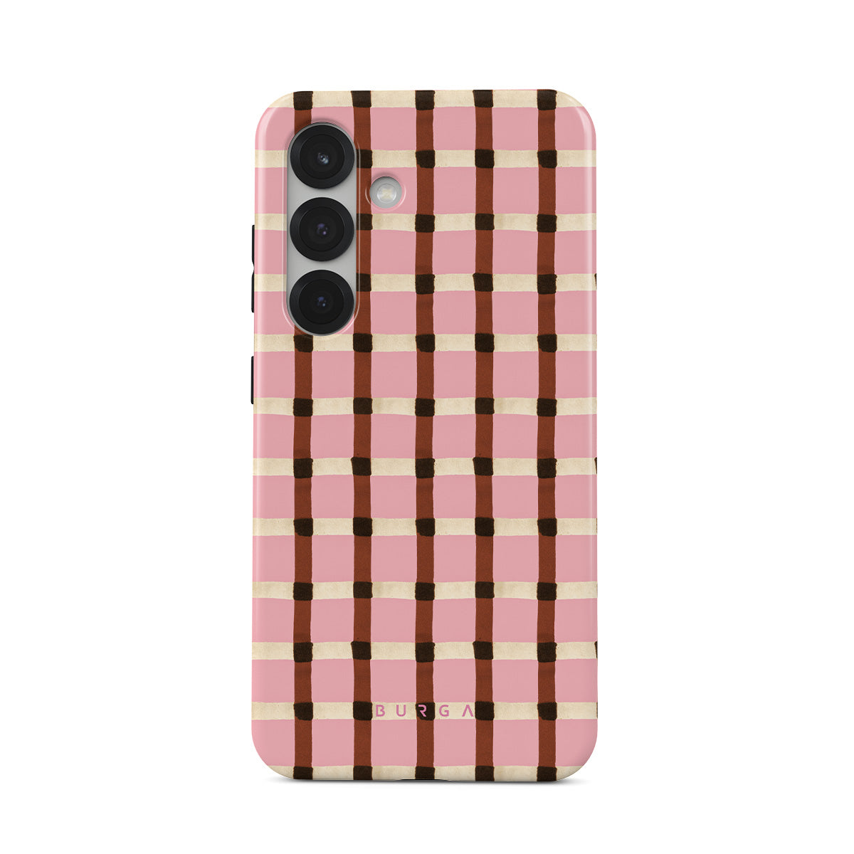 This design features: pink and brown checkered pattern, gingham pattern