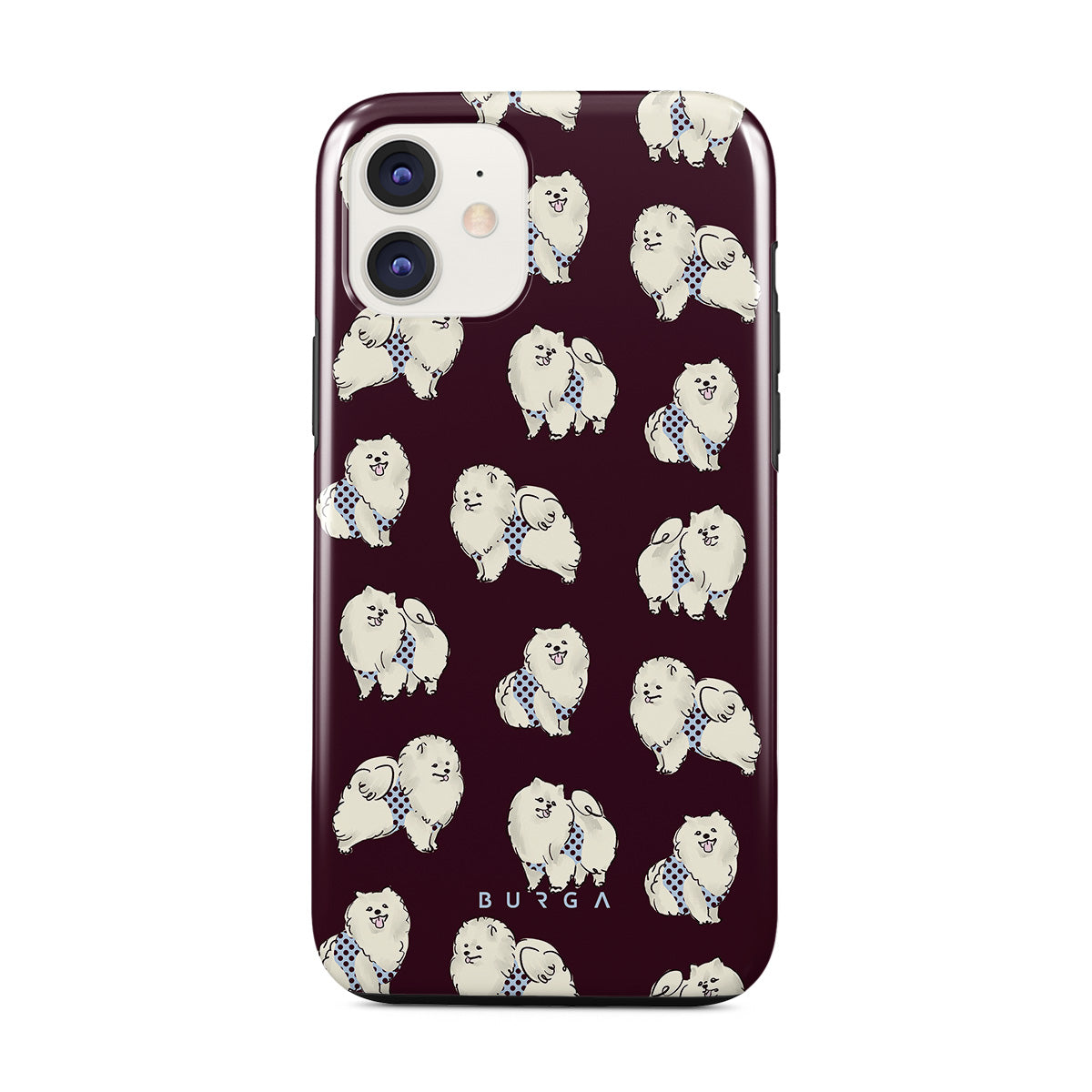 This design features: white fluffy dogs on a deep burgundy background, poodles, pets.