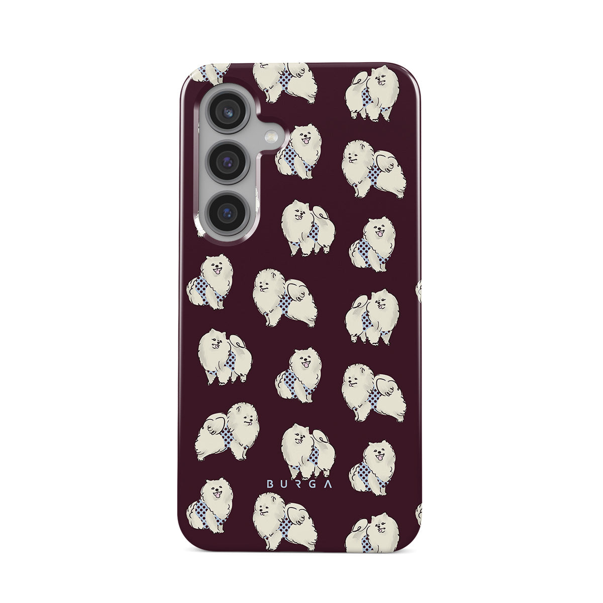 This design features: white fluffy dogs on a deep burgundy background, poodles, pets.