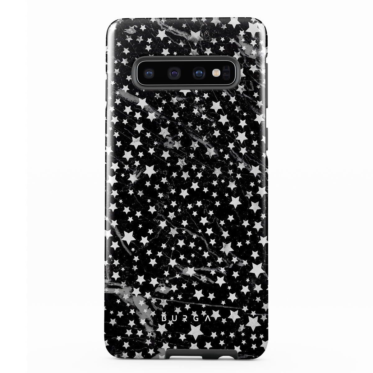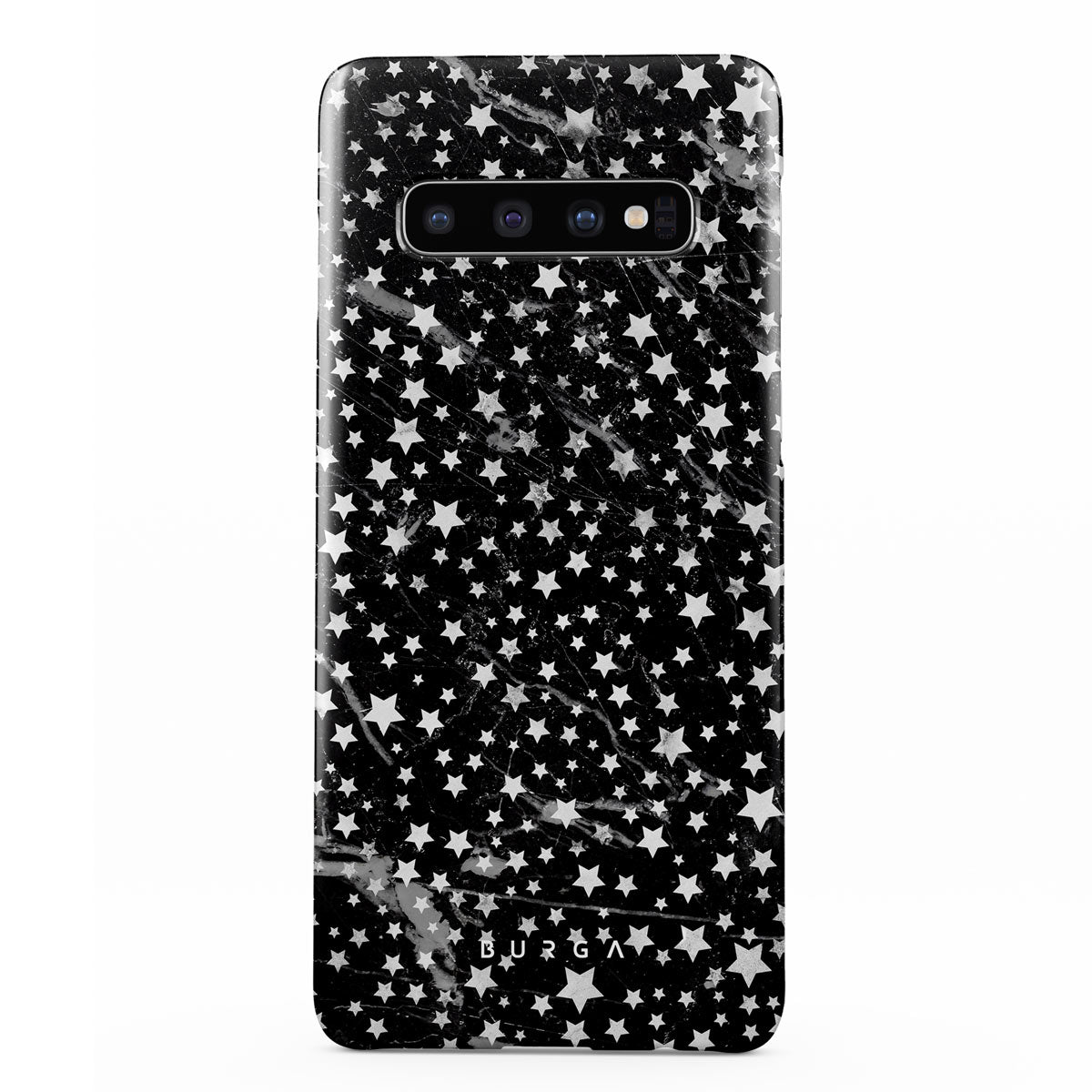 Samsung Galaxy S10 Plus phone case is inspired by the sky above us. Here the charming star pattern meets with a trendy black and white marble. Add the unique combination to your wardrobe and transform your protective phone case into a fashion accessory.