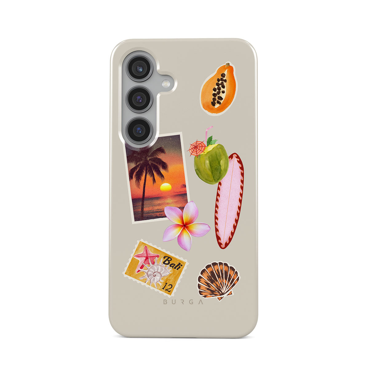 This design features: tropical sunset photo, papaya, green coconut, pink surfboard, pink plumeria flower, orange shell, Bali postcard