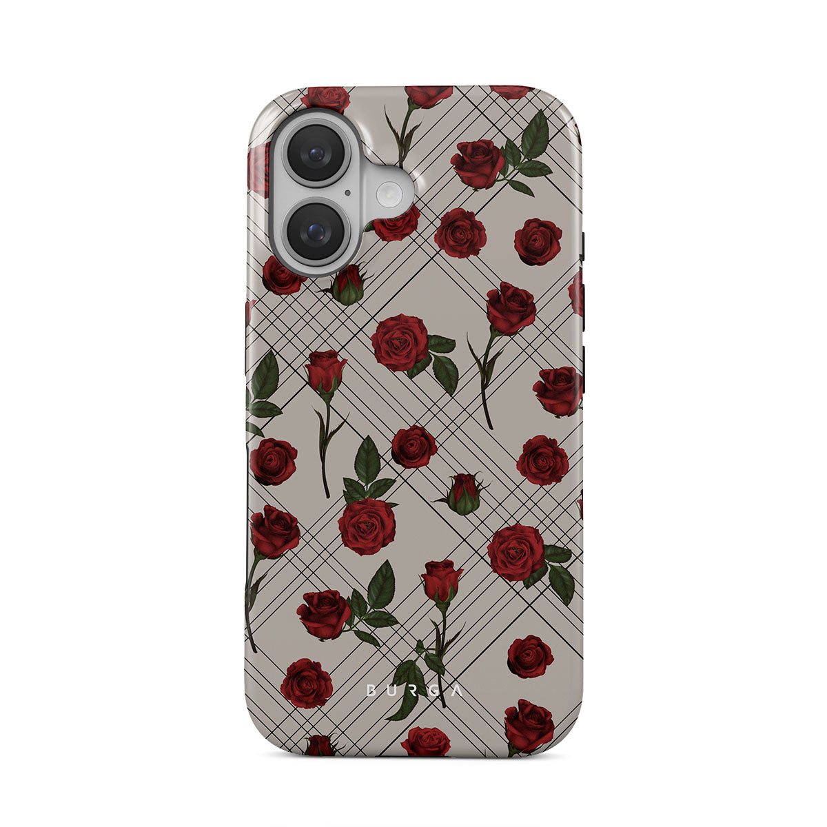 Embrace the subtle rebellion of our Sweet Sin iPhone 16 Plus phone case design. On a muted nude-gray canvas, scattered small red roses hint at passions hidden beneath the surface. A design that balances the delicate with the daring. Crafted for those who find beauty in the unexpected and wear their edge with elegance.