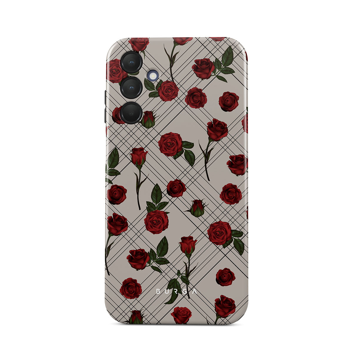 Embrace the subtle rebellion of our Sweet Sin Samsung Galaxy A15 4G / 5G phone case design. On a muted nude-gray canvas, scattered small red roses hint at passions hidden beneath the surface. A design that balances the delicate with the daring. Crafted for those who find beauty in the unexpected and wear their edge with elegance.