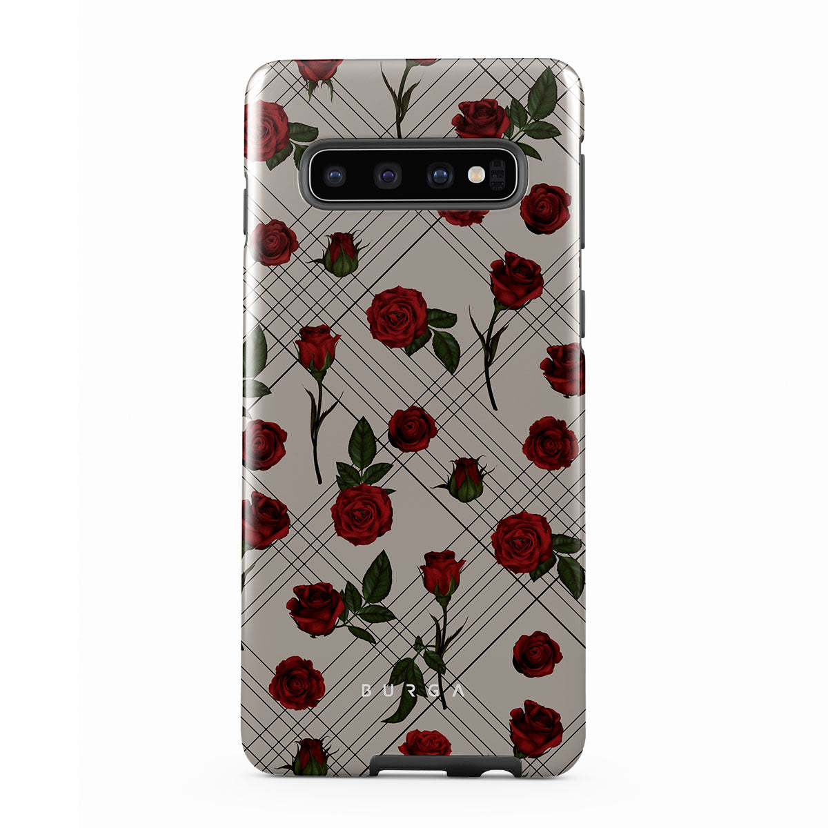 Embrace the subtle rebellion of our Sweet Sin Samsung Galaxy S10 4G phone case design. On a muted nude-gray canvas, scattered small red roses hint at passions hidden beneath the surface. A design that balances the delicate with the daring. Crafted for those who find beauty in the unexpected and wear their edge with elegance.