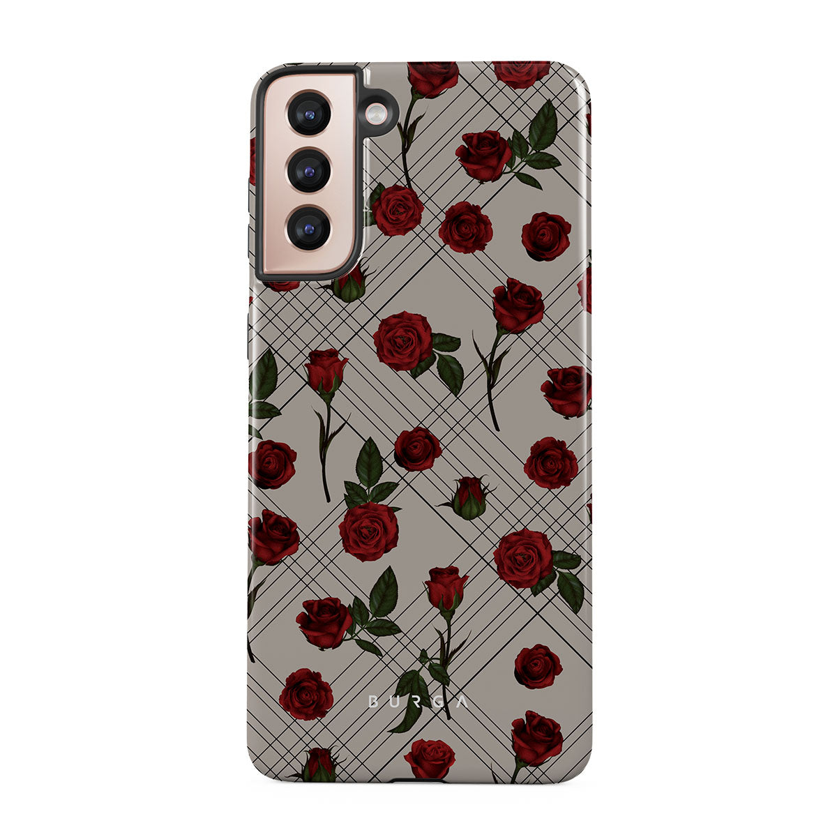 Embrace the subtle rebellion of our Sweet Sin Samsung Galaxy S21 Plus phone case design. On a muted nude-gray canvas, scattered small red roses hint at passions hidden beneath the surface. A design that balances the delicate with the daring. Crafted for those who find beauty in the unexpected and wear their edge with elegance.