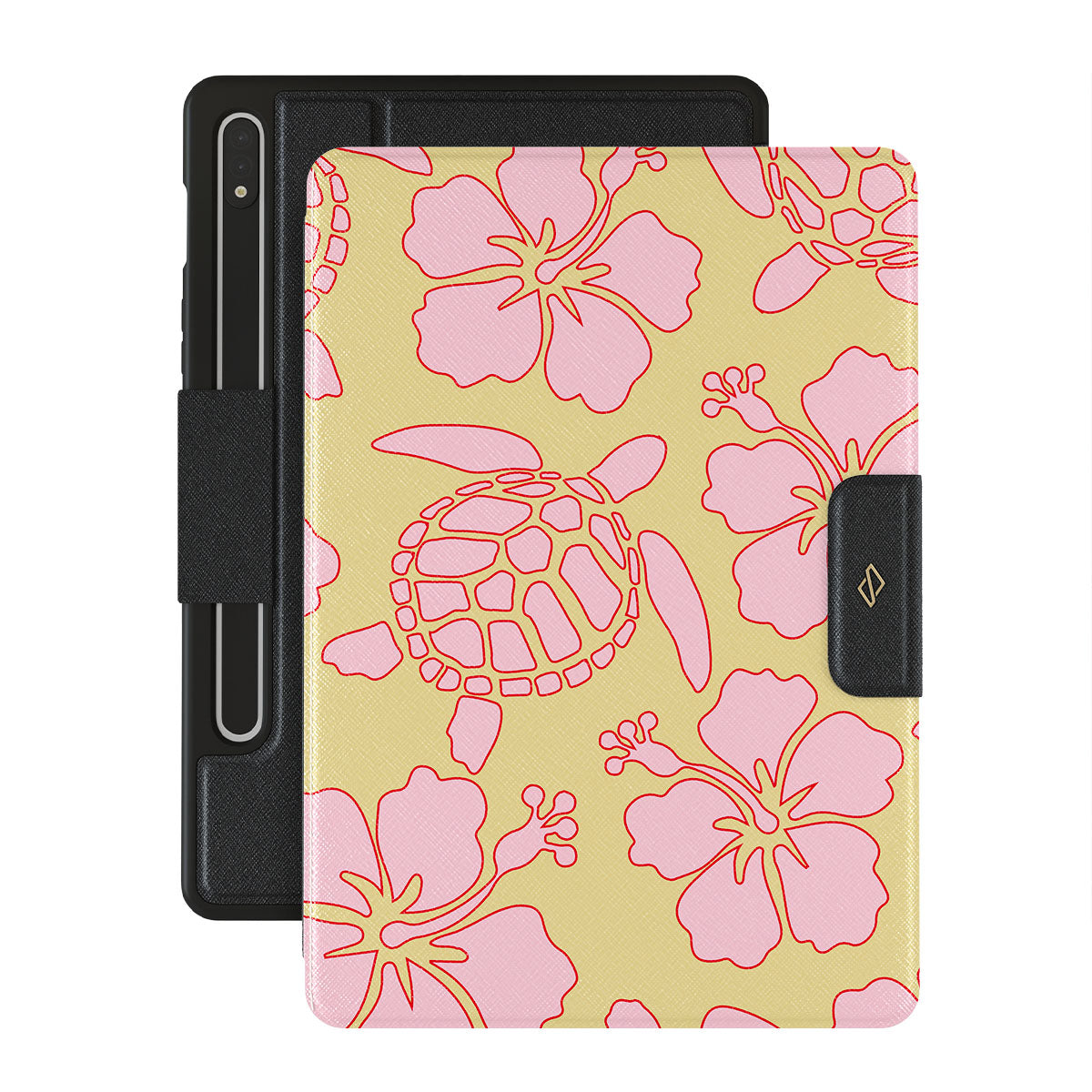 The Tan Break Samsung Galaxy Tab S8+/S7+/S7 FE folio case features a vibrant design with pink flowers and sea turtles on a sunny yellow background. This tropical-inspired pattern exudes a laid-back, beachy vibe, perfect for those who love vibrant and nature-themed aesthetics.