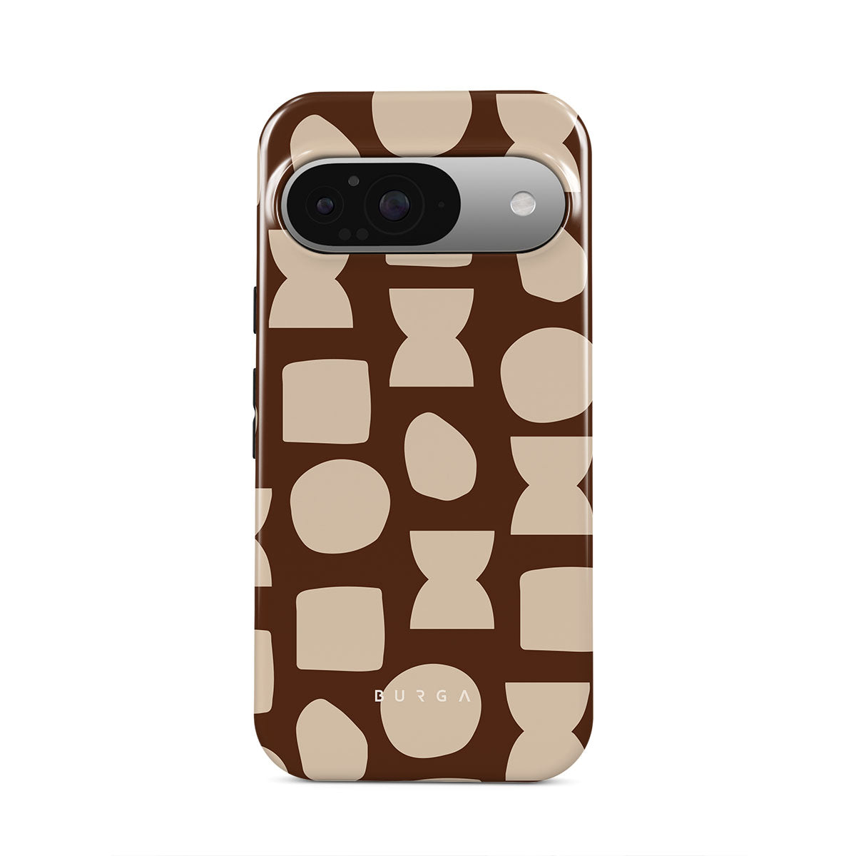Our Terracotta Google Pixel 9 phone case design whispers warmth and grounded energy. Against a rich brown background, an interplay of light shapes unfolds, captivating the eye with an array of circles, squares, and hourglasses. Each shape is a testament to the beauty found in simplicity.