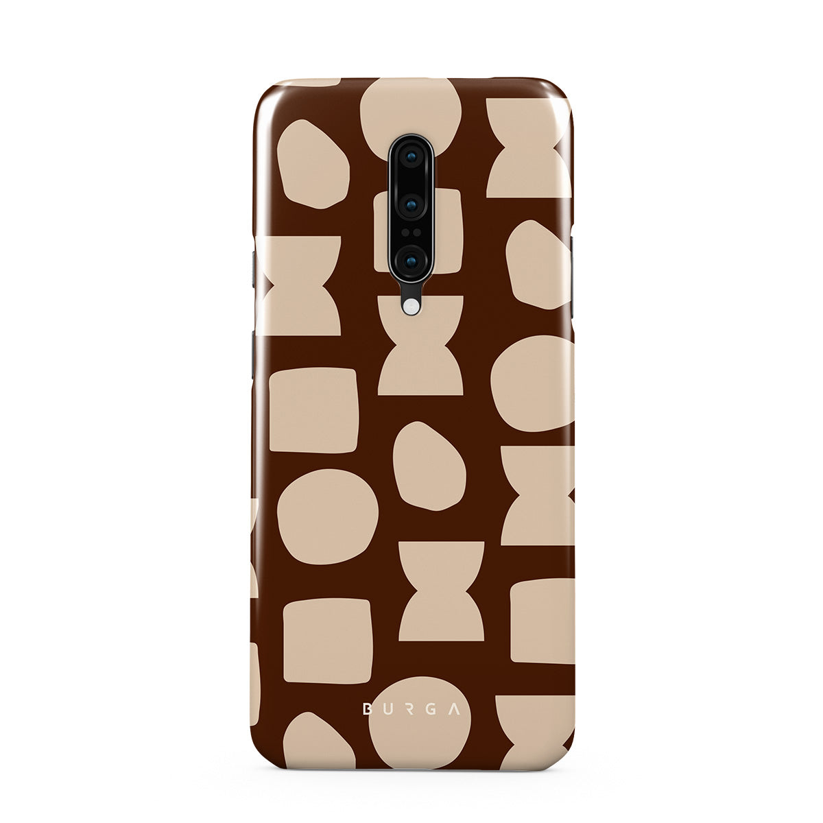 Our Terracotta OnePlus 7 Pro / 7T Pro phone case design whispers warmth and grounded energy. Against a rich brown background, an interplay of light shapes unfolds, captivating the eye with an array of circles, squares, and hourglasses. Each shape is a testament to the beauty found in simplicity.