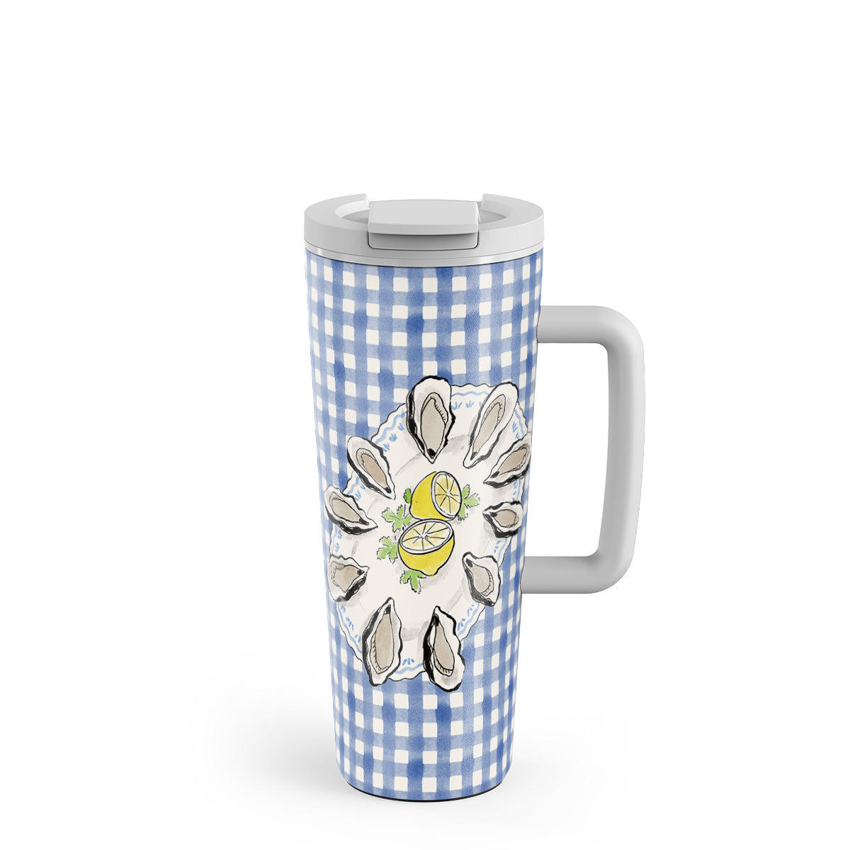 This design features: oysters, lemon, blue gingham, fresh coastal elements, soft pastel tones.