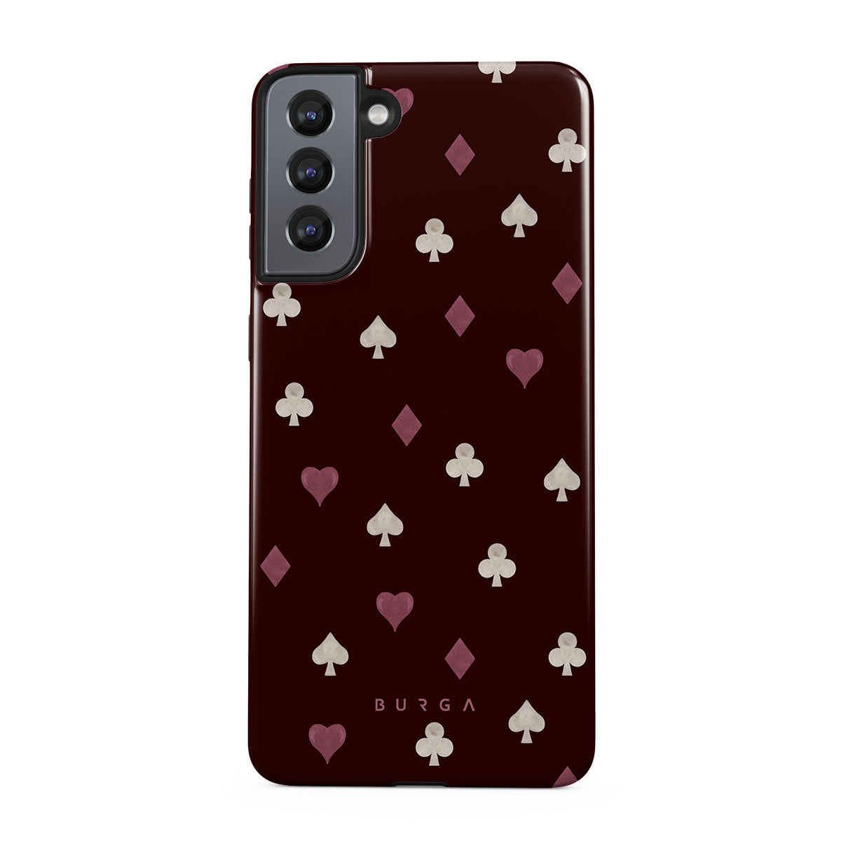 Nothing is as it appears. Hearts, clubs, diamonds, and spades—stacked in your favor or playing against you? This Samsung Galaxy S21 phone case design features a rich burgundy background and minimalist suits that make for a game where the rules are constantly shifting.