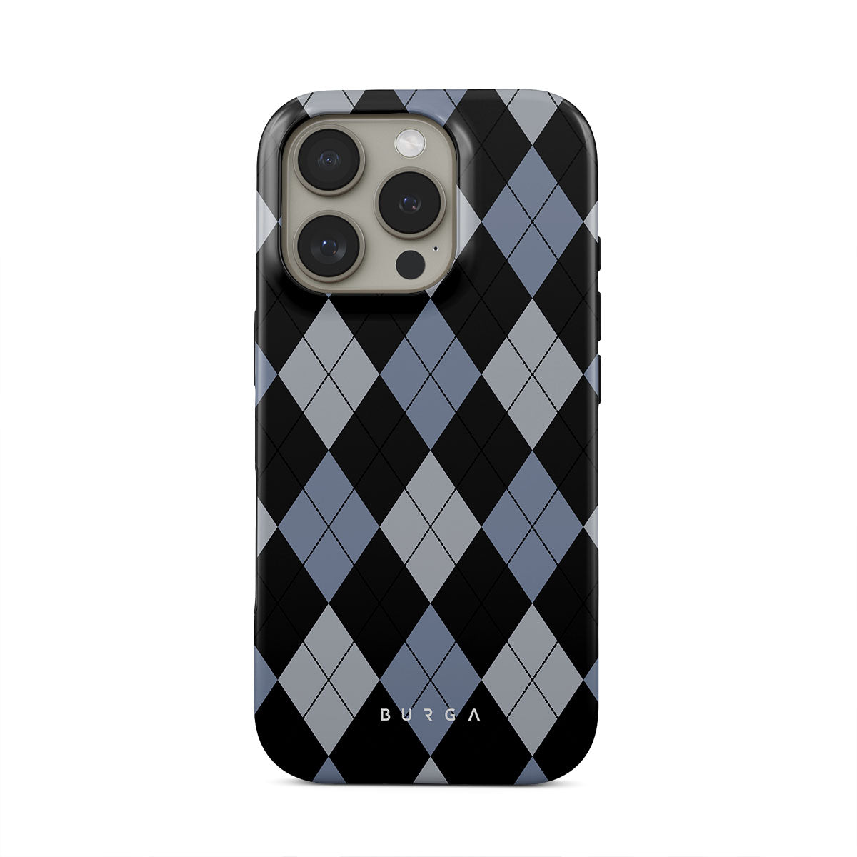 Discover our Trouble iPhone 16 Pro Max phone case design—a classic argyle pattern featuring stark black diamonds that seamlessly blend with two distinct shades of blue. Made for those who respect the classics but aren't afraid to disrupt the norm.