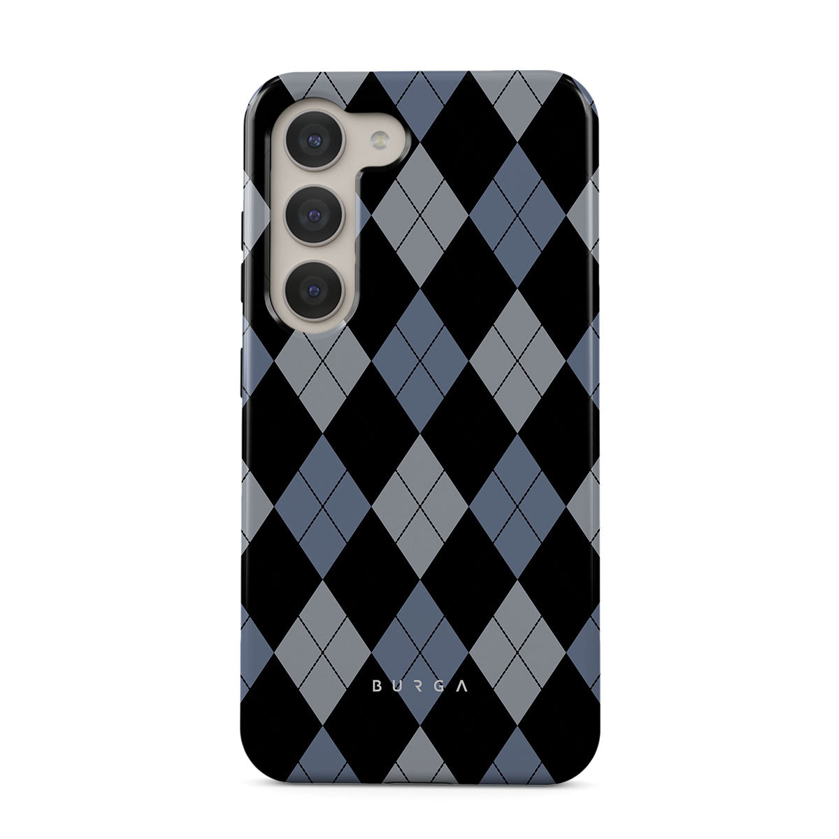 Discover our Trouble Samsung Galaxy S23 phone case design—a classic argyle pattern featuring stark black diamonds that seamlessly blend with two distinct shades of blue. Made for those who respect the classics but aren't afraid to disrupt the norm.