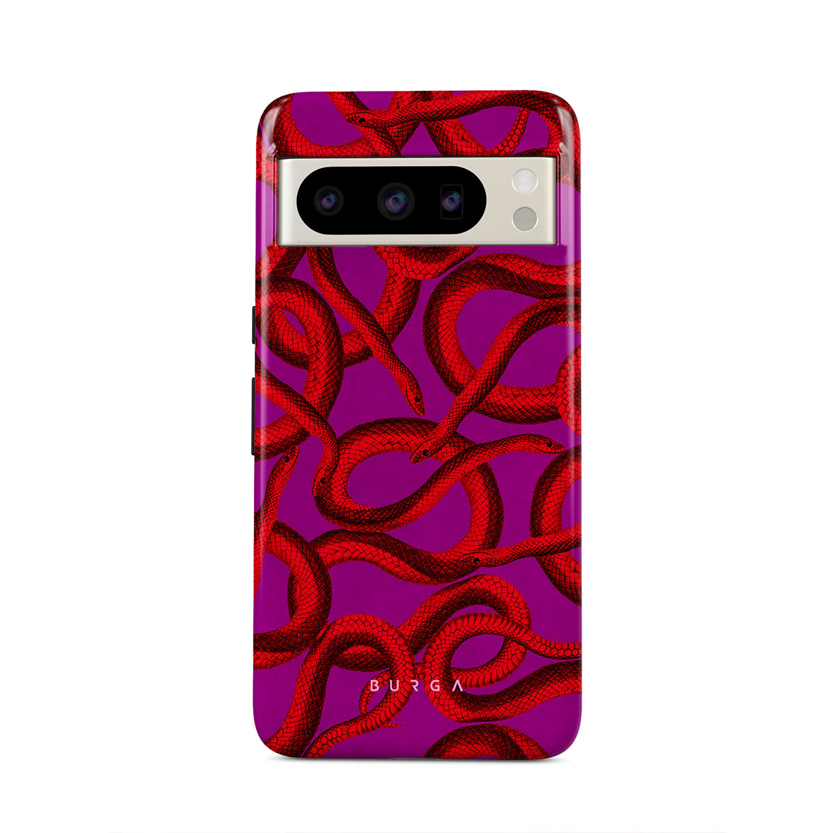 Watch Out Google Pixel 8 Pro phone case design offers a fierce feel with a bright magenta colored background covered in red snakes pattern. Make a statement while protecting your phone, as this case is guaranteed to catch everyone's eye.