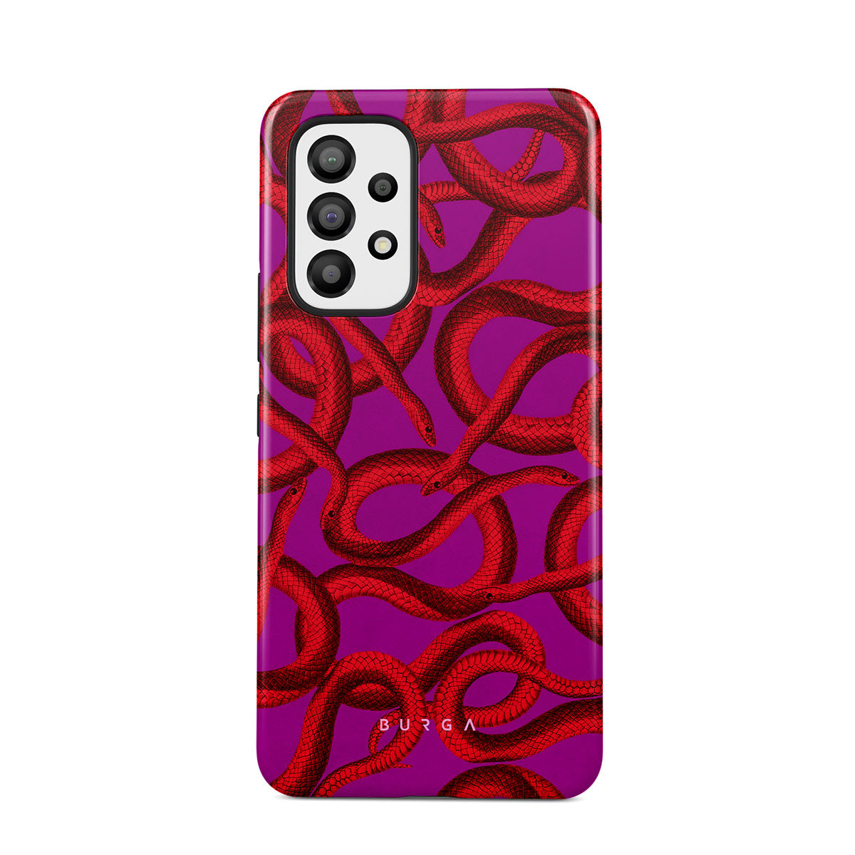 Watch Out Samsung Galaxy A33 phone case design offers a fierce feel with a bright magenta colored background covered in red snakes pattern. Make a statement while protecting your phone, as this case is guaranteed to catch everyone's eye.