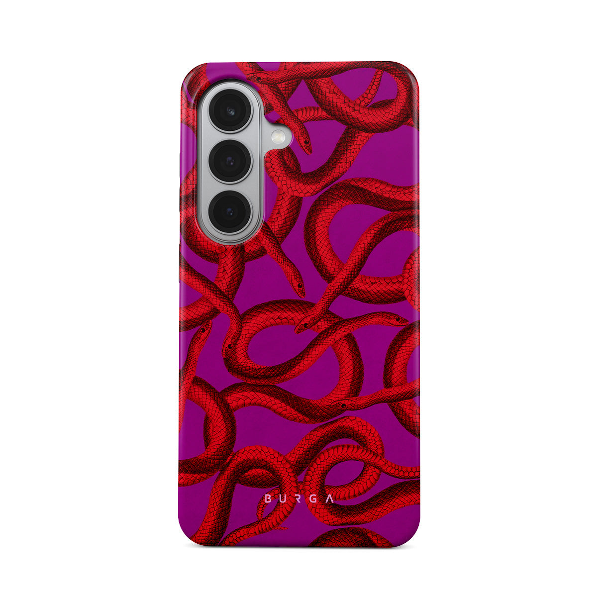 Watch Out Samsung Galaxy S26 Plus phone case design offers a fierce feel with a bright magenta colored background covered in red snakes pattern. Make a statement while protecting your phone, as this case is guaranteed to catch everyone's eye.