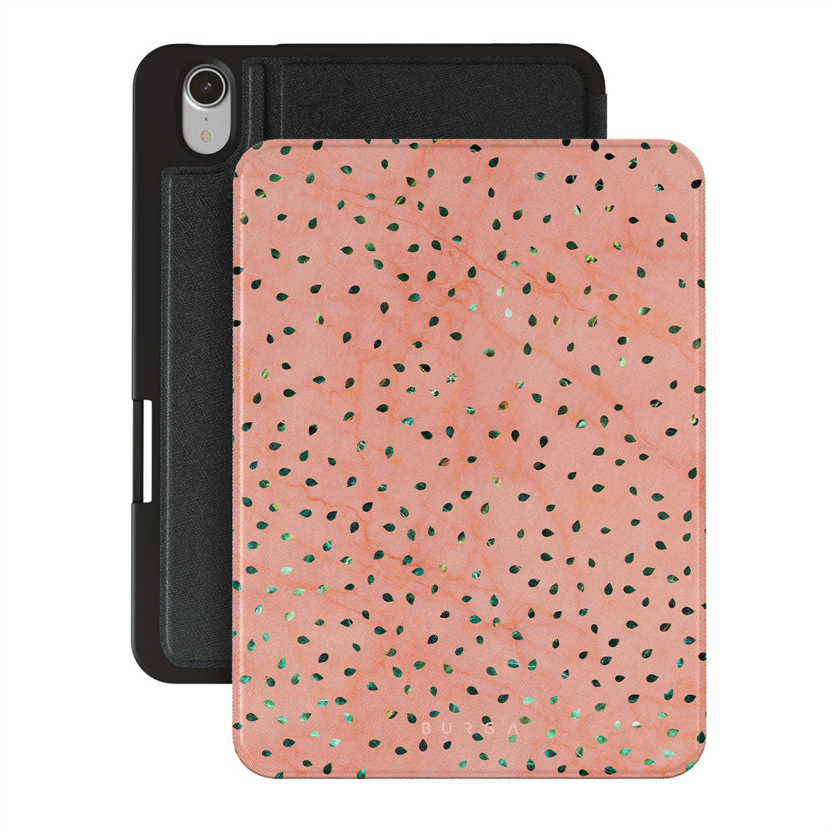 The Watermelon Shake iPad Mini 8.3 (A17 Pro/6th Gen) 2021 folio case offers a playful take on design merging. The watermelon seed-like specks showcase striking tropical design fragments that add a splash of color to the fresh and breezy coral pink marble. This way, the funny protective iPad cover becomes a perfect statement piece for your summer outfits.