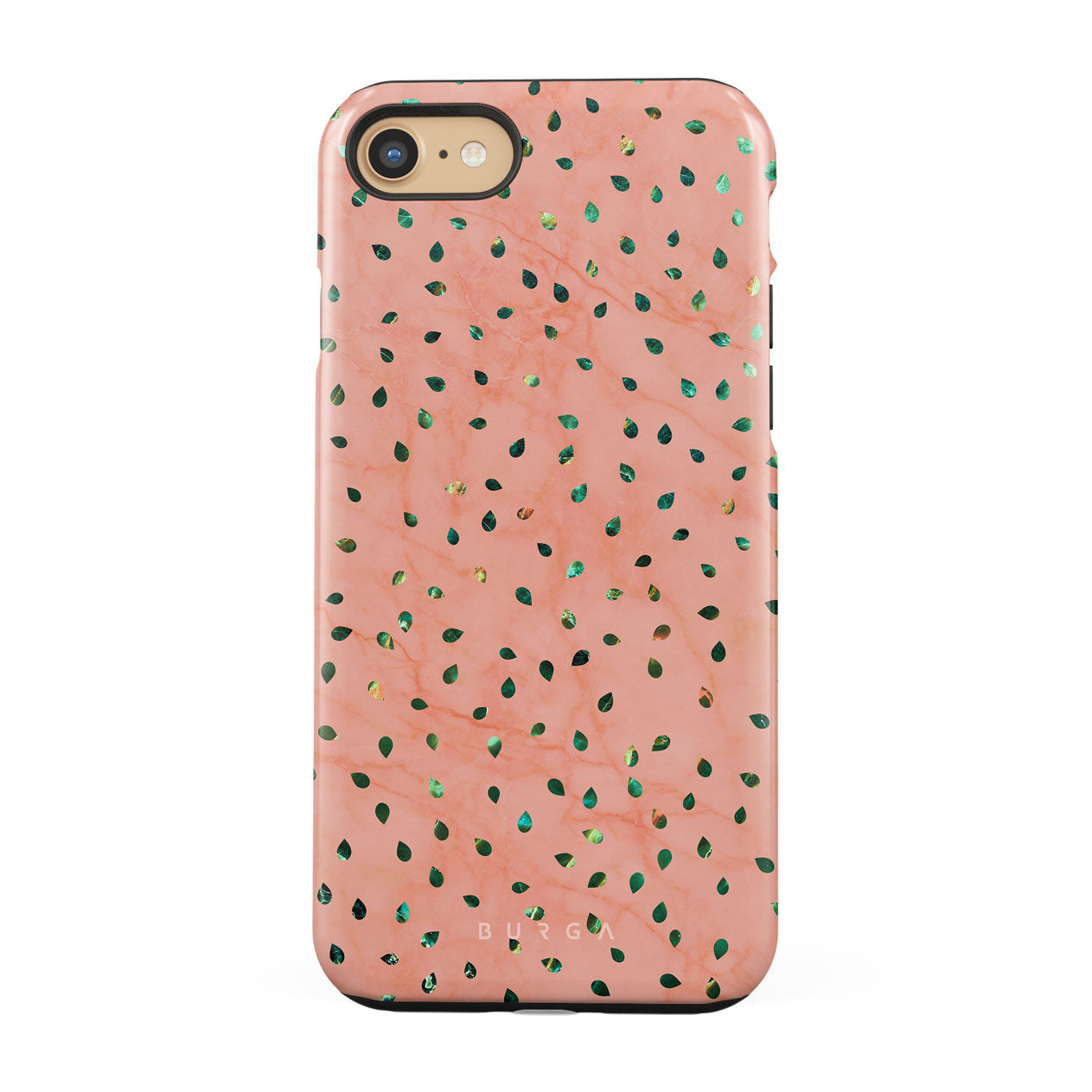 The Watermelon Shake iPhone SE (2022) phone case offers a playful take on design merging. The watermelon seed-like specks showcase striking tropical design fragments that add a splash of color to the fresh and breezy coral pink marble. This way, the funny protective phone cover becomes a perfect statement piece for your summer outfits.
