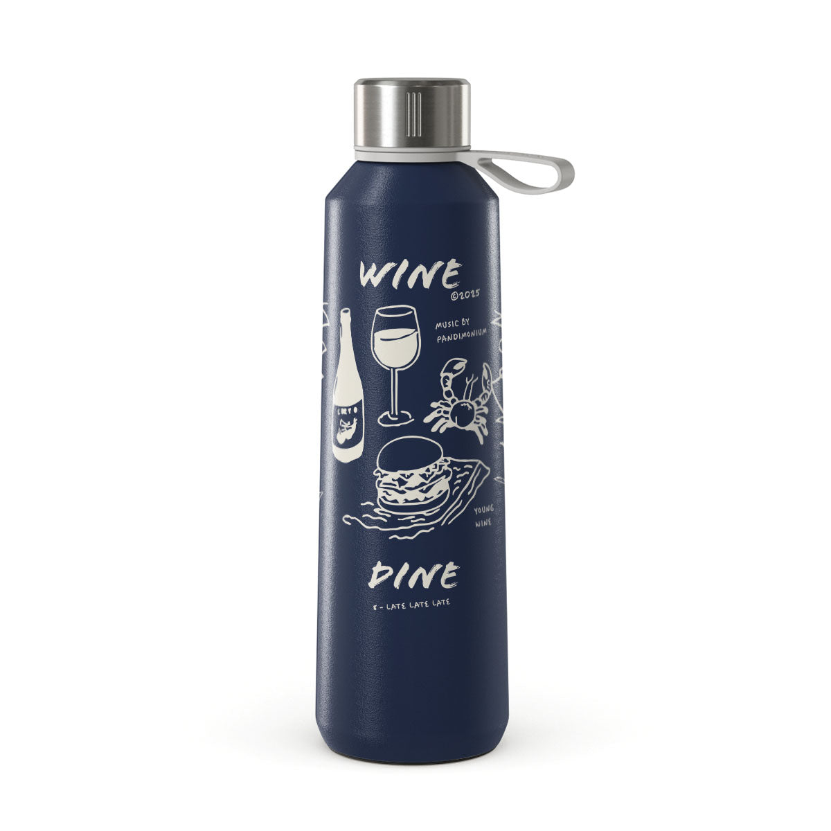 This design features: wine glasses, food, dining, minimalist illustrations, text