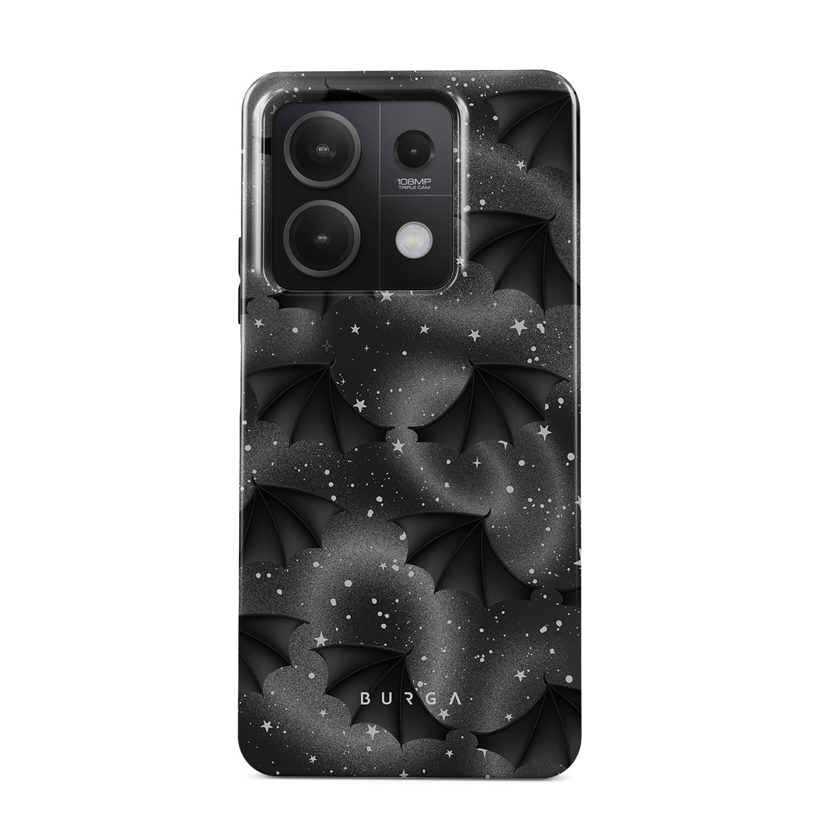 This design features: bat wings, stars, mystical swirls, black sky